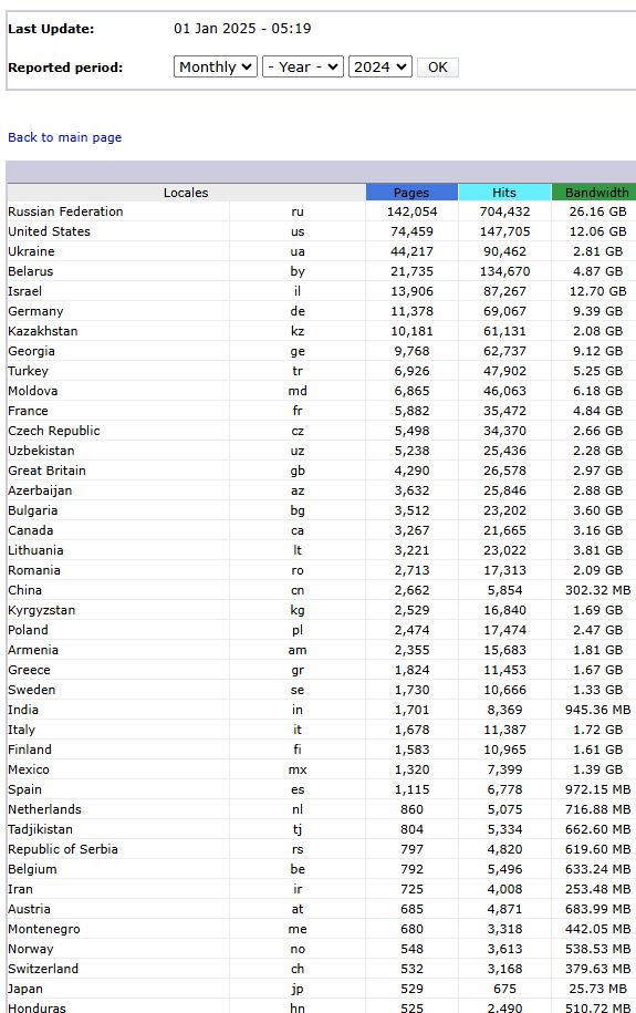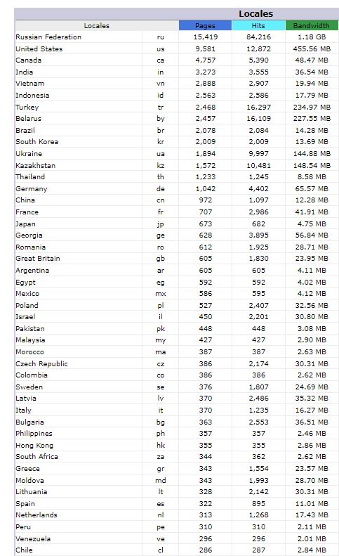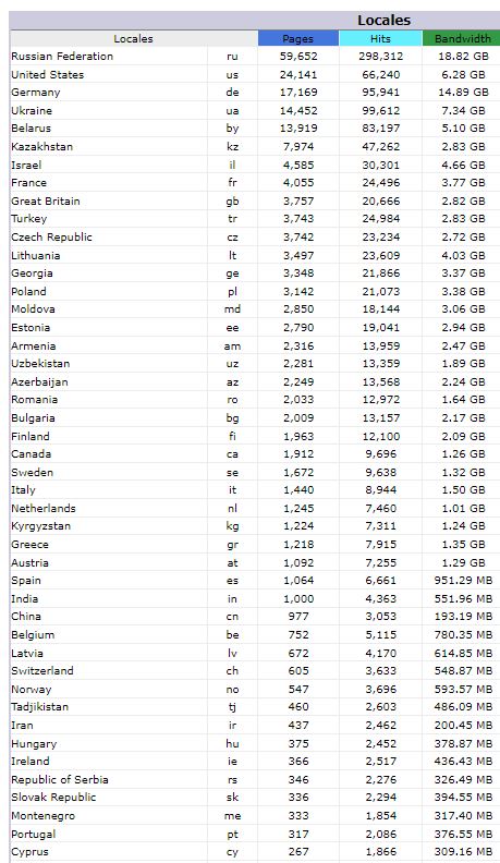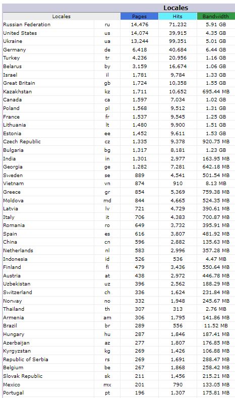 Количество просмотренных страниц по странам (первые 40)